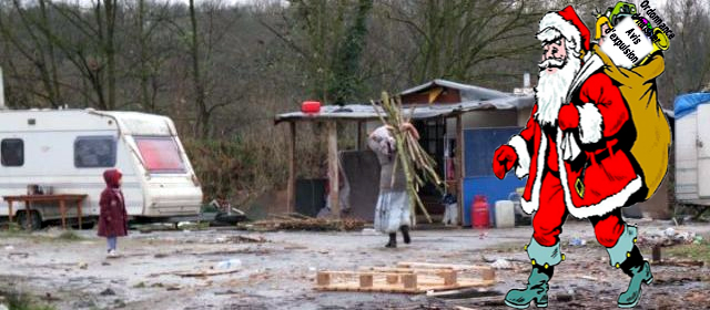 Près d'Evry, des familles roms sommairement installées avec enfants reçoivent leur avis d'expulsion par père Noël